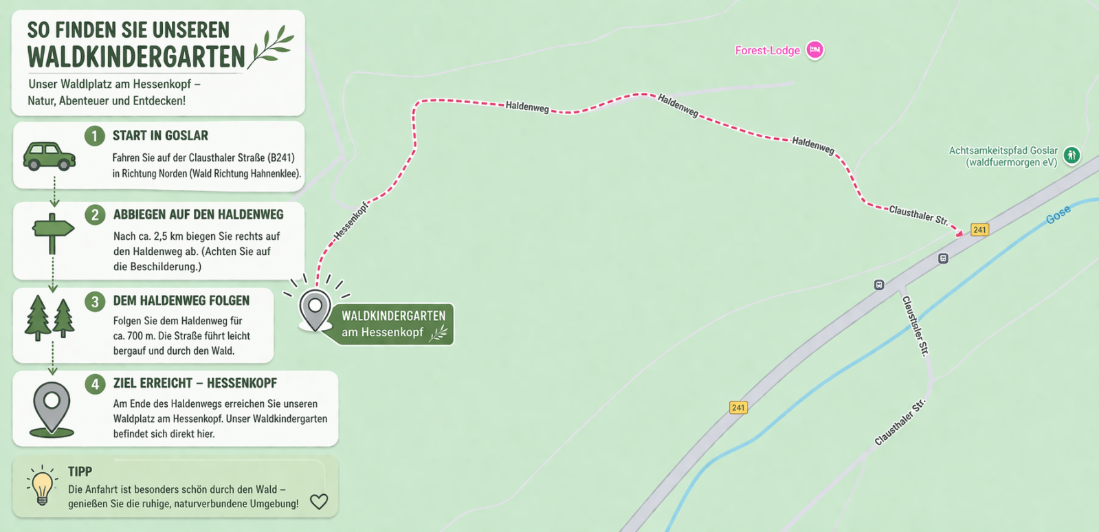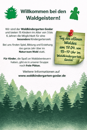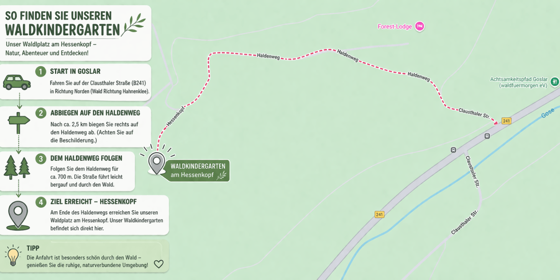 Tag des offenen Waldes 17.04.2026 15:00 - 17:00 Uhr Scroll to content Teilen Bei Facebook teilen Bei Twitter teilen Startseite Termine Möchten Sie mehr über die Waldgruppe erfahren?Wir freuen uns über Ihren Besuch beim Tag des offenen Waldes am 17.04.2026 von 15-17 Uhr! So finden Sie unseren Waldkindergarten:(Klicken zum Vergrößern)
